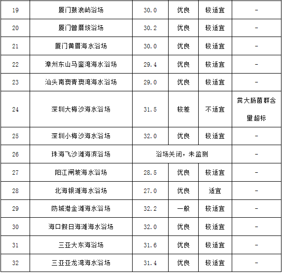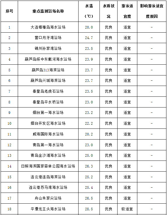 大連棒棰島海水浴場、營口月牙灣浴場、錦州孫家灣浴場、葫蘆島綏中東戴河海水浴場、葫蘆島313海濱浴場、葫蘆島興城海濱浴場、秦皇島老虎石浴場、秦皇島平水橋浴場、煙臺(tái)第一海水浴場、煙臺(tái)開發(fā)區(qū)海水浴場、威海國際海水浴場、青島第一海水浴場、青島金沙灘海水浴場、日照海濱國家森林公園海水浴場、連云港連島海濱浴場、連云港蘇馬灣海水浴場、舟山朱家尖浴場、平潭龍王頭海水浴場、廈門鼓浪嶼浴場、廈門曾厝垵浴場、廈門黃厝海水浴場、漳州東山馬鑾灣海水浴場、汕頭南澳青澳灣海水浴場、深圳小梅沙海水浴場、陽江閘坡海水浴場、北海銀灘海水浴場、?诩偃蘸┖K觥⑷齺喆髺|海浴場、三亞亞龍灣海水浴場共29個(gè)海水浴場水質(zhì)優(yōu)良。