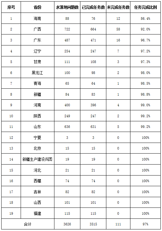 為貫徹落實(shí)黨中央、國務(wù)院關(guān)于打好水源地保護(hù)攻堅(jiān)戰(zhàn)的決策部署,生態(tài)環(huán)境部與各。▍^(qū)、市)持續(xù)推進(jìn)水源地環(huán)境問題整治工作。按照部署安排,在2018年已完成長江經(jīng)濟(jì)帶11省份縣級(jí)及以上水源地整治的基礎(chǔ)上,2019年應(yīng)完成其他20。▍^(qū)、市)和新疆生產(chǎn)建設(shè)兵團(tuán)縣級(jí)及以上水源地環(huán)境問題清理整治,共涉及156個(gè)地市527個(gè)縣899個(gè)水源地3626個(gè)環(huán)境問題,任務(wù)十分艱巨。