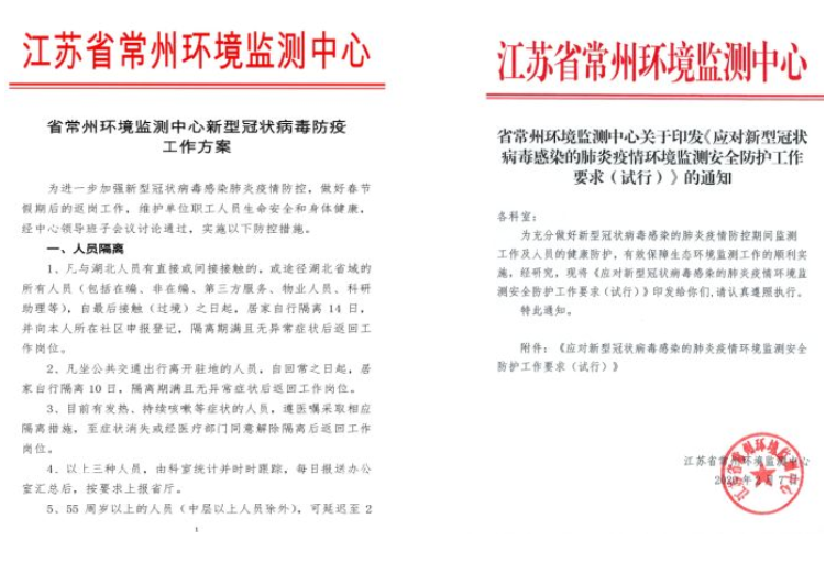 為有效應(yīng)對疫情,常州環(huán)境監(jiān)測中心提前謀劃,1月27日(年初三)就有針對性地開展應(yīng)急防疫物資儲備和研究部署疫情防控工作,1月29日(年初五)制定了《江蘇省常州環(huán)境監(jiān)測中心關(guān)于復(fù)工的防護措施》。隨后根據(jù)江蘇省生態(tài)環(huán)境廳相關(guān)要求,進一步明確和完善,制定了《江蘇省常州環(huán)境監(jiān)測中心新型冠狀病毒防疫工作方案》以及《江蘇省常州環(huán)境監(jiān)測中心應(yīng)對新型冠狀病毒感染的肺炎疫情應(yīng)急監(jiān)測方案(試行)》,確保防控責(zé)任、監(jiān)測工作“雙落實”。