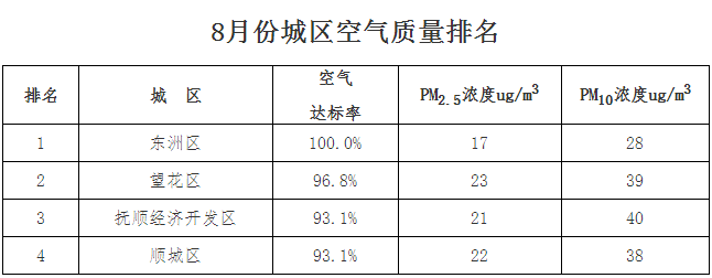8月份,城區(qū)空氣質(zhì)量達(dá)標(biāo)天數(shù)29天,與上年同期持平,達(dá)標(biāo)率為93.5%,PM10濃度為34ug/m3,同比持平;PM2.5濃度為20ug/m3,同比上升17.6%。與上年同期相比,望花區(qū)增加3天,順城區(qū)減少1天,東洲區(qū)增加1天,撫順經(jīng)濟(jì)開發(fā)區(qū)持平。