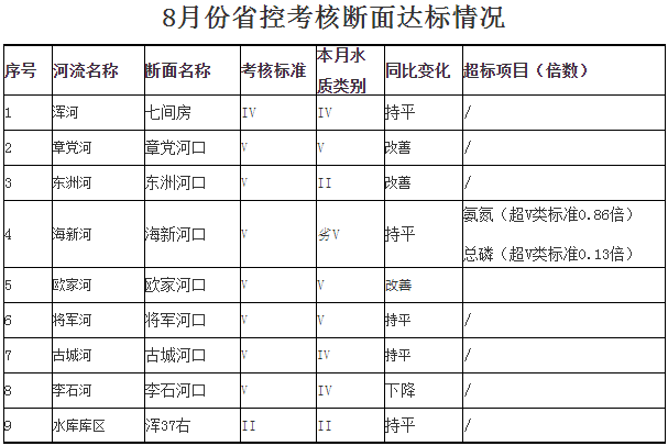 8月份主要河流水質(zhì)達(dá)標(biāo)情況