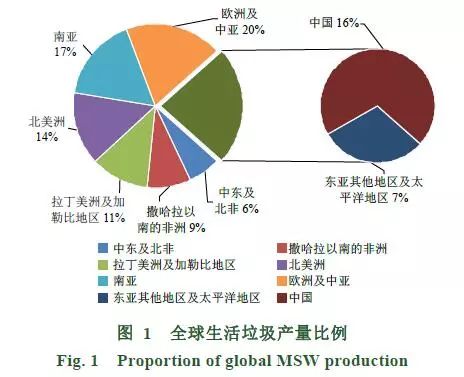 圖1 為全球生活垃圾產(chǎn)量比例,可以看出,垃圾產(chǎn)量最大的地區(qū)為東亞及太平洋地區(qū),占全球總產(chǎn)量的23%,其次是歐洲及中亞地區(qū),占全球總產(chǎn)量的20%。其中,東亞及太平洋地區(qū)的垃圾產(chǎn)量中有70%的生活垃圾來自中國,即中國的生活垃圾產(chǎn)量占全球總產(chǎn)量的16%,這和我國近幾年經(jīng)濟(jì)的飛速發(fā)展有很大關(guān)系。