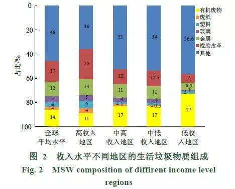 1)將生活垃圾分為有機(jī)垃圾、廢紙、塑料、玻璃、金屬、橡膠皮革和其他7類。按照2018年世界銀行統(tǒng)計(jì)數(shù)據(jù),按經(jīng)濟(jì)發(fā)展水平分類討論全球不同收入地區(qū)的垃圾組成,如圖2所示。由圖2 可見,從全球平均水平來看,生活垃圾中有機(jī)廢物占比最大,占垃圾總量的46%。由高收入地區(qū)向低收入地區(qū)過渡,其有機(jī)廢物含量逐漸增加,廢紙、塑料、玻璃、金屬和橡膠皮革的占比逐漸降低,而其他類的占比是逐漸增大的,這體現(xiàn)出了高收入地區(qū)的垃圾分類效果比低收入地區(qū)好,我國屬于中高收入地區(qū)。