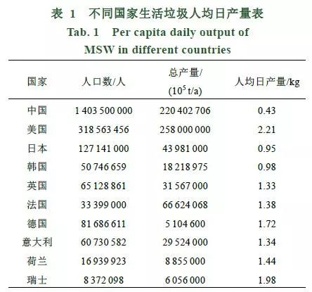表1為2018年世界銀行統(tǒng)計(jì)的部分國家生活垃圾年產(chǎn)量及人均日產(chǎn)量的數(shù)據(jù)。由表1可以看出,雖然中國的城市生活垃圾總產(chǎn)量比較高,但城市生活垃圾人均日產(chǎn)量比其他發(fā)達(dá)國家都要低,甚至不足美國生活垃圾人均日產(chǎn)量的1/5,說明經(jīng)濟(jì)越發(fā)達(dá)的地區(qū),其生活垃圾產(chǎn)量也越高。