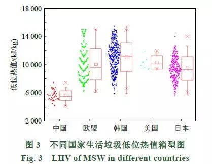 由圖3可以看出,韓國的生活垃圾熱值整體水平最高,中值和平均值均達(dá)到了11000kJ/kg,這是由于韓國在生活垃圾處理源頭處將生活垃圾進(jìn)行分類處理,回收可利用的生活垃圾,生活垃圾回收率達(dá)到58%,而進(jìn)行焚燒處理的生活垃圾僅占垃圾總量的25%。另外,歐盟國家、美國和日本焚燒處理的生活垃圾的熱值分別為10065、10341、9485kJ/kg,均高于我國焚燒處理的生活垃圾的熱值5781kJ/kg。