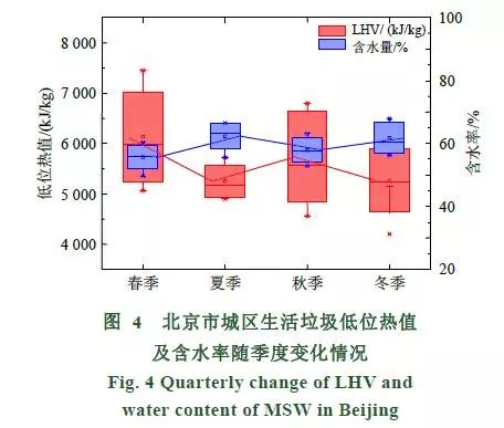 圖4是北京市城區(qū)生活垃圾低位熱值及含水率隨季節(jié)變化情況?梢钥闯,垃圾熱值受季節(jié)性影響較大,這主要是不同季節(jié)垃圾中的含水率不同。在夏季,居民所吃的瓜果較多,垃圾中果皮較多,垃圾含水率明顯增加,導(dǎo)致垃圾熱值的減少;冬季由于是在年前,家家戶戶準(zhǔn)備年貨,因此造成了垃圾含水率較高,進(jìn)而造成垃圾熱值的減少。針對這個(gè)問題,可以專門在夏季和冬季設(shè)置瓜果蔬皮回收設(shè)施,以減少垃圾中的含水率,進(jìn)而提高熱值。