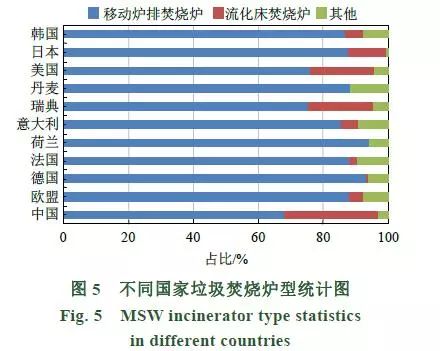全球生活垃圾焚燒爐型的數(shù)據(jù)如圖5 所示。由圖5可見,移動(dòng)爐排焚燒爐技術(shù)在世界生活垃圾焚燒技術(shù)中占主導(dǎo)地位,被認(rèn)為是一種經(jīng)過技術(shù)測試的環(huán)?尚械纳罾贌夹g(shù)。在全球范圍看,發(fā)達(dá)國家的生活垃圾焚燒技術(shù)大多數(shù)選用移動(dòng)爐排焚燒技術(shù)。而在我國有29%的生活垃圾焚燒廠采用流化床焚燒爐,這是由于在生活垃圾焚燒初期時(shí)建廠者熱衷于將國產(chǎn)鍋爐技術(shù)應(yīng)用于垃圾焚燒,并且該技術(shù)的建設(shè)成本較低。但是后續(xù)存在很多問題(如生活垃圾需要預(yù)處理,飛灰產(chǎn)生量大,容易產(chǎn)生二噁英等),這導(dǎo)致了流化床焚燒技術(shù)逐漸遭到淘汰。我國目前在建的生活垃圾焚燒廠中采用移動(dòng)爐排焚燒技術(shù)的占了絕大多數(shù)。