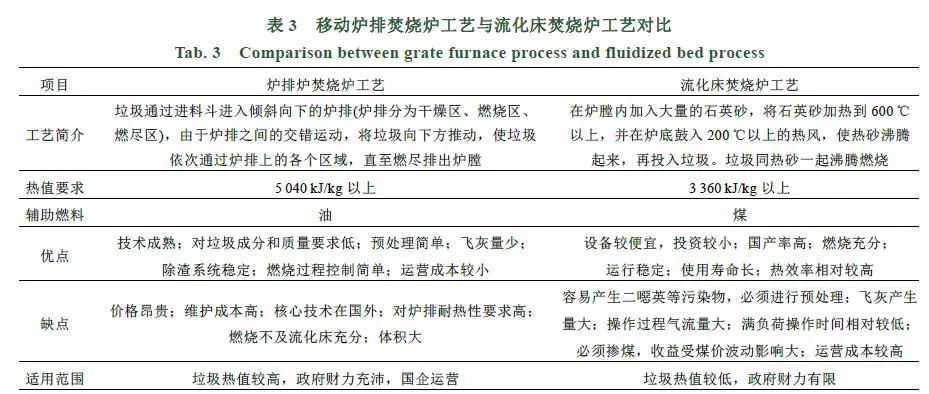 移動(dòng)爐排焚燒爐適用于大規(guī)模燃燒不均勻的生活垃圾,而流化床焚燒爐只適用于燃燒經(jīng)過預(yù)處理的和均質(zhì)的生活垃圾。2種焚燒技術(shù)的工藝對比如表3所示。
