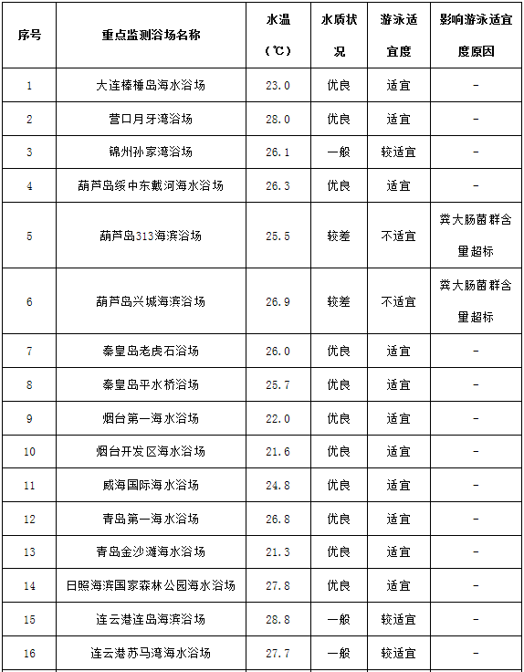大連棒棰島海水浴場(chǎng)、營(yíng)口月牙灣浴場(chǎng)、葫蘆島綏中東戴河海水浴場(chǎng)、秦皇島老虎石浴場(chǎng)、秦皇島平水橋浴場(chǎng)、煙臺(tái)第一海水浴場(chǎng)、煙臺(tái)開(kāi)發(fā)區(qū)海水浴場(chǎng)、威海國(guó)際海水浴場(chǎng)、青島第一海水浴場(chǎng)、青島金沙灘海水浴場(chǎng)、日照海濱國(guó)家森林公園海水浴場(chǎng)、廈門(mén)鼓浪嶼浴場(chǎng)、廈門(mén)黃厝海水浴場(chǎng)、漳州東山馬鑾灣海水浴場(chǎng)、汕頭南澳青澳灣海水浴場(chǎng)、深圳大梅沙海水浴場(chǎng)、深圳小梅沙海水浴場(chǎng)、陽(yáng)江閘坡海水浴場(chǎng)、?诩偃蘸┖K(chǎng)、三亞大東海浴場(chǎng)、三亞亞龍灣海水浴場(chǎng)共21個(gè)海水浴場(chǎng)水質(zhì)優(yōu)良。