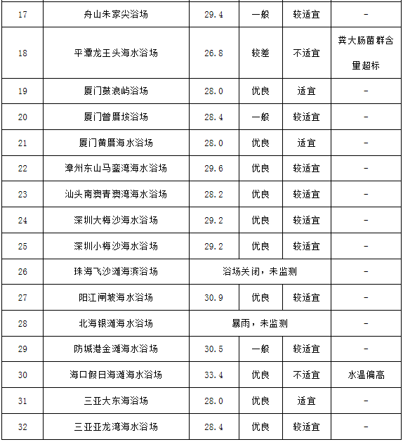 2019年8月17日~8月23日,國(guó)家海洋環(huán)境監(jiān)測(cè)中心組織對(duì)遼寧、河北、山東、江蘇、浙江、福建、廣東、廣西、海南9個(gè)省(自治區(qū))的22個(gè)沿海城市32個(gè)海水浴場(chǎng)開(kāi)展水質(zhì)監(jiān)測(cè)。珠海飛沙灘海濱浴場(chǎng)關(guān)閉未監(jiān)測(cè)、北海銀灘海水浴場(chǎng)因暴雨未監(jiān)測(cè),其他30個(gè)海水浴場(chǎng)監(jiān)測(cè)結(jié)果如下: