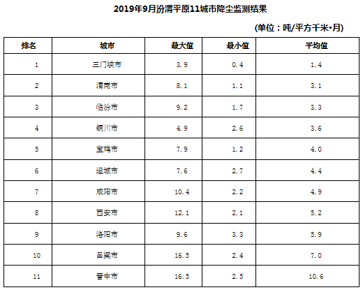 9月,汾渭平原11城市降塵量均值范圍在1.4–10.6噸/平方千米·月之間,平均為4.9噸/平方千米·月。三門(mén)峽、渭南、臨汾、銅川、寶雞、運(yùn)城、咸陽(yáng)、西安、洛陽(yáng)、呂梁等10個(gè)城市降塵量均值小于9.0噸/平方千米·月;晉中市降塵量均值大于9.0噸/平方千米·月,達(dá)10.6噸/平方千米·月。呂梁等5個(gè)城市降塵量最大值大于9.0噸/平方千米·月。汾渭平原11城市9月降塵監(jiān)測(cè)結(jié)果詳見(jiàn)附表2。