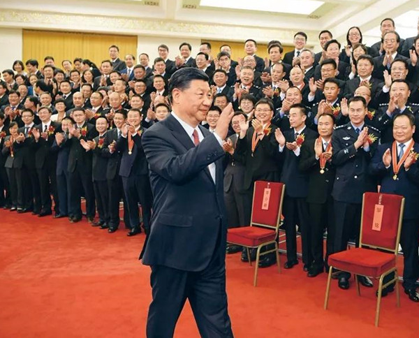 2019年6月25日,黨和國家領(lǐng)導(dǎo)人習(xí)近平、李克強、王滬寧等在北京人民大會堂會見第九屆全國“人民滿意的公務(wù)員”和“人民滿意的公務(wù)員集體”受表彰代表。李學(xué)仁 攝