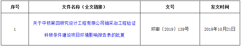 生態(tài)環(huán)境部關(guān)于2019年10月21日—2019年10月25日作出的建設(shè)項(xiàng)目環(huán)境影響評(píng)價(jià)文件審批決定的公告(核與輻射)