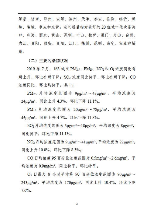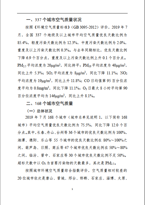2019年7月全國(guó)城市空氣質(zhì)量報(bào)告